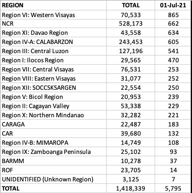 For the first time since the start of the pandemic last year, Western Visayas took the lead today, and by a mile. NCR is in second and Davao Region in third. CALABARZON and Central Luzon round up the rest of the top five regions. Notice that all these regions in the top five have more than 500 cases apiece.