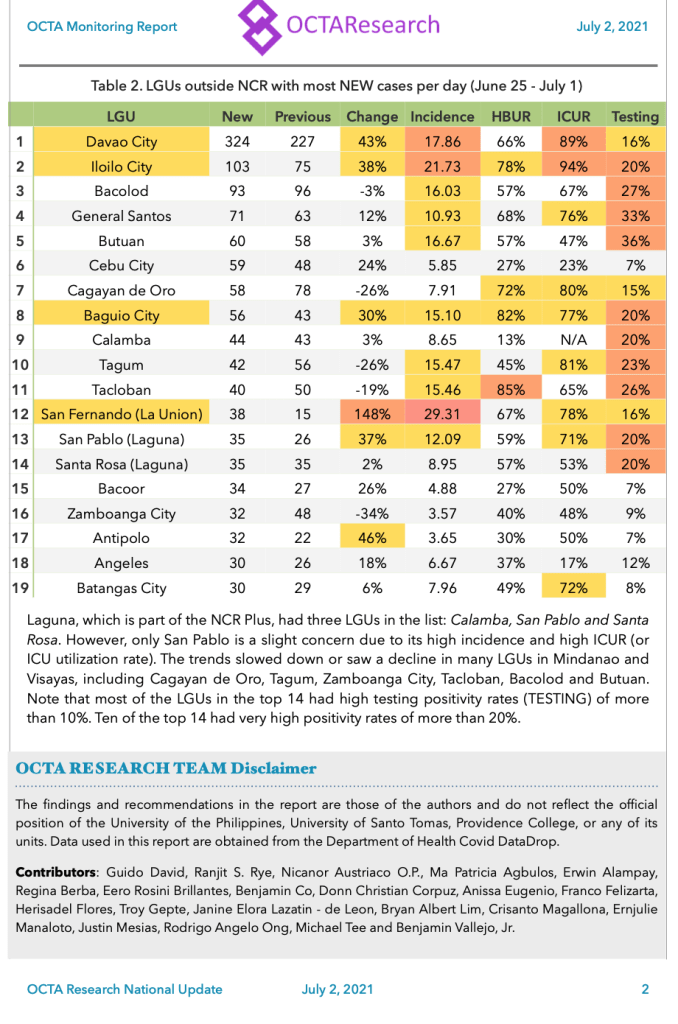 The OCTA Research Monitoring Report for July 2 shows that the National Capital Region (Mega Manila) saw an uptick of 5% in cases from the previous week. This, as the Rt jumps from 0.72 to 0.82 over the same period. The Rt in the country is also up from 0.92 to 0.97. The incidence rate in NCR is around 5 cases per day per 100,000 population. While the positivity rate is lower at 6% over the last week and healthcare utilization is also lower. In the NCR, three LGUs that are doing well are Navotas, Pateros and Malabon. Seven of 17 LGUs in NCR had incidence less than 5/100,000.