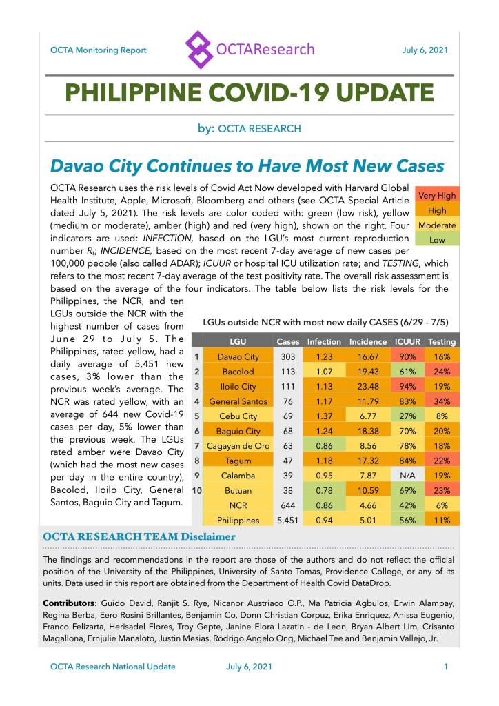 The OCTA Research Monitoring update for July 6, 2021 shows that Davao City continued to lead among cases.