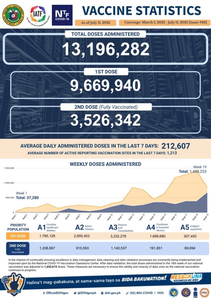 As of July 11, the DoH reports that more than 13M doses of COVID-19 vaccines have been given. More than 3.5M have been fully vaccinated bringing the percentage of fully vaccinated to 3.2% of the population (which may be higher at 5.1% considering the eligible population is only approximately 70M).