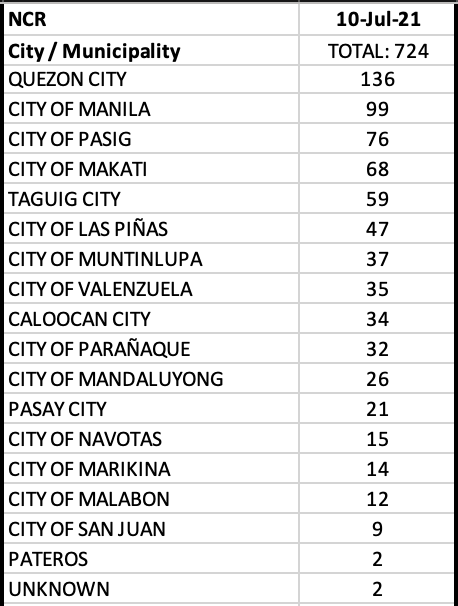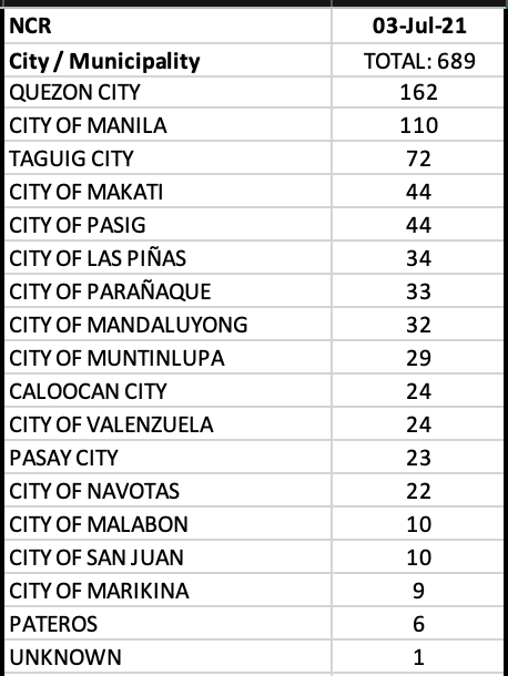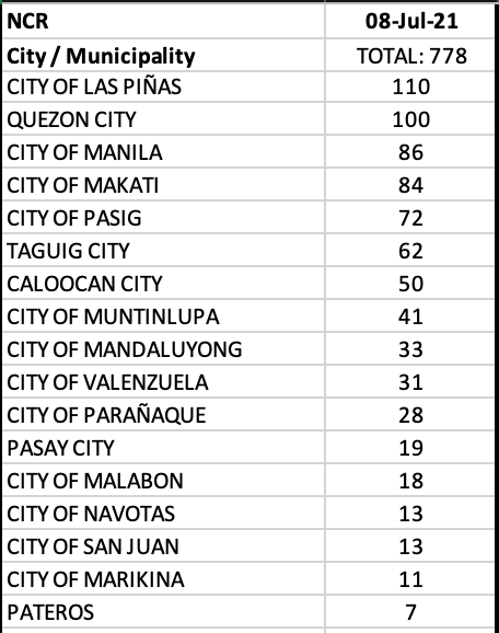 In NCR, Quezon City remained the top contributor to the daily cases with triple digits.
