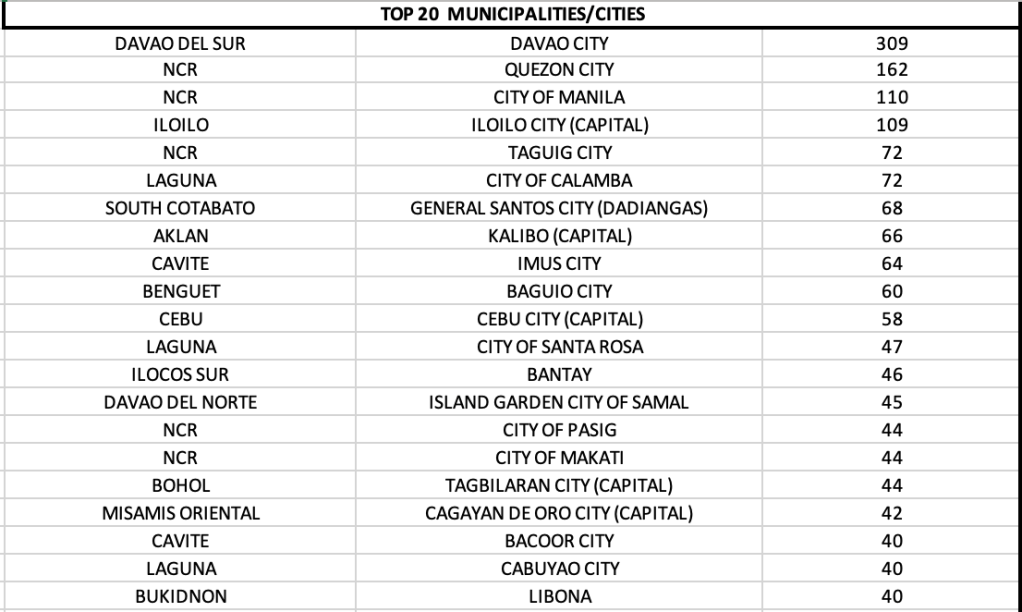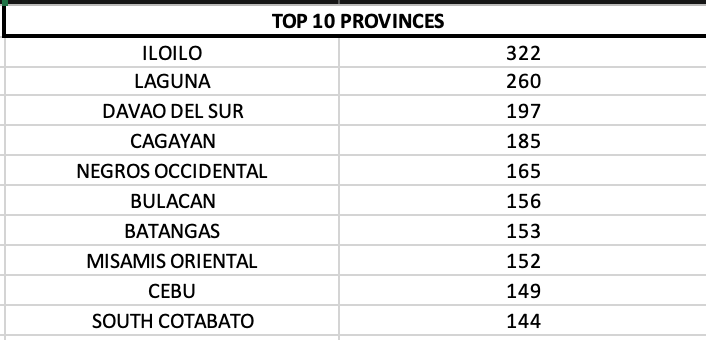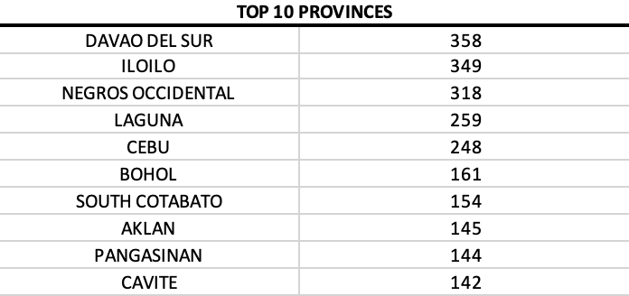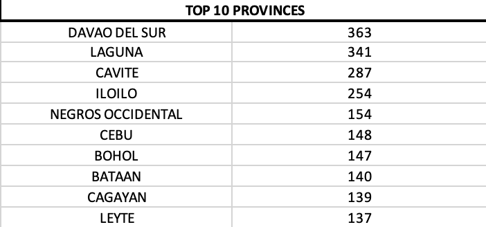 On a provincial level, Davao del Sur, Laguna and Iloilo dominate the top three provinces.