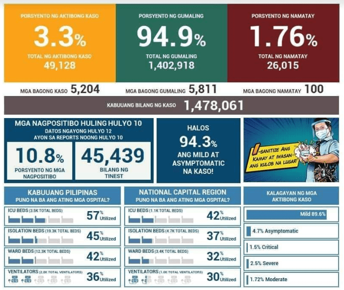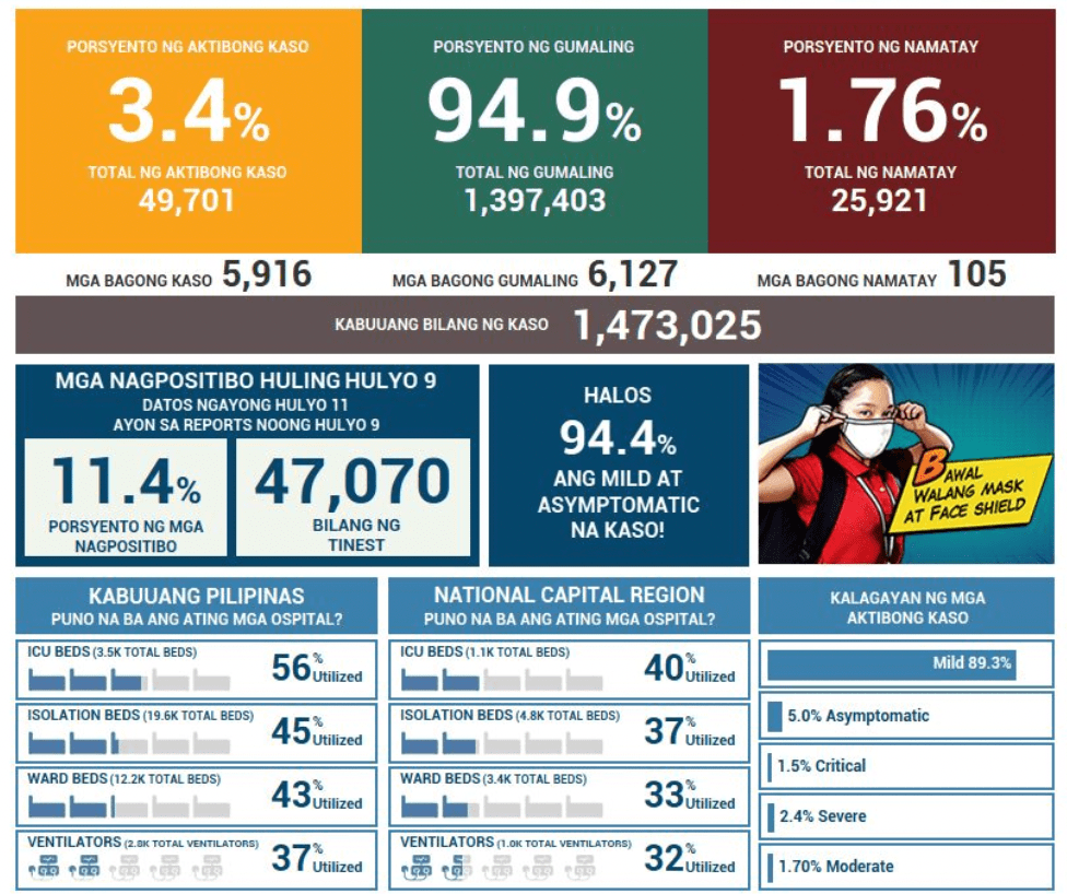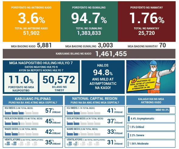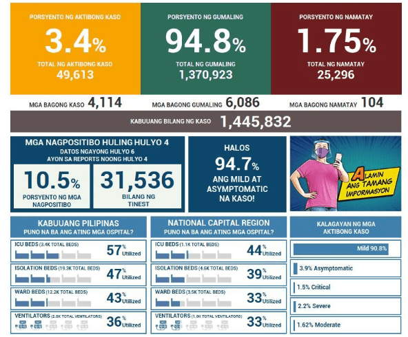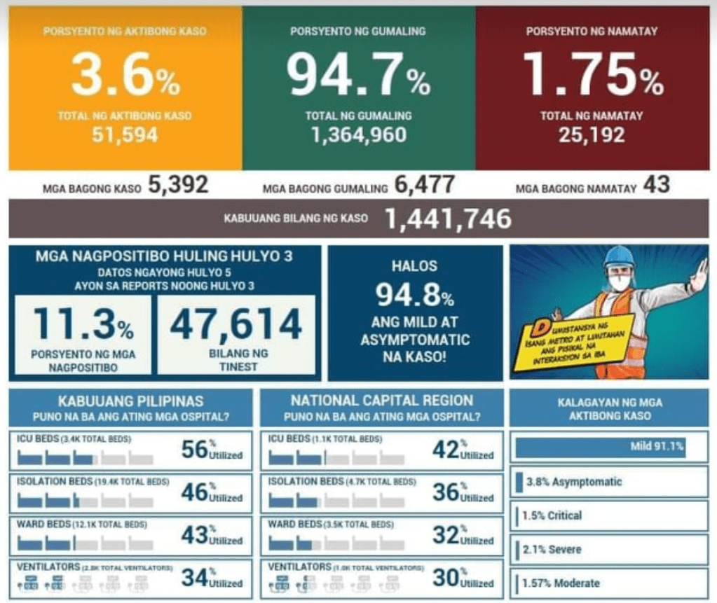 The Health Agency reports 4,289 new cases for tests done last July 5 with 11.3% positivity rate. This pushes the total now to more than 1.45M COVID-19 cases. There were 4 laboratories that failed to submit results for this day.