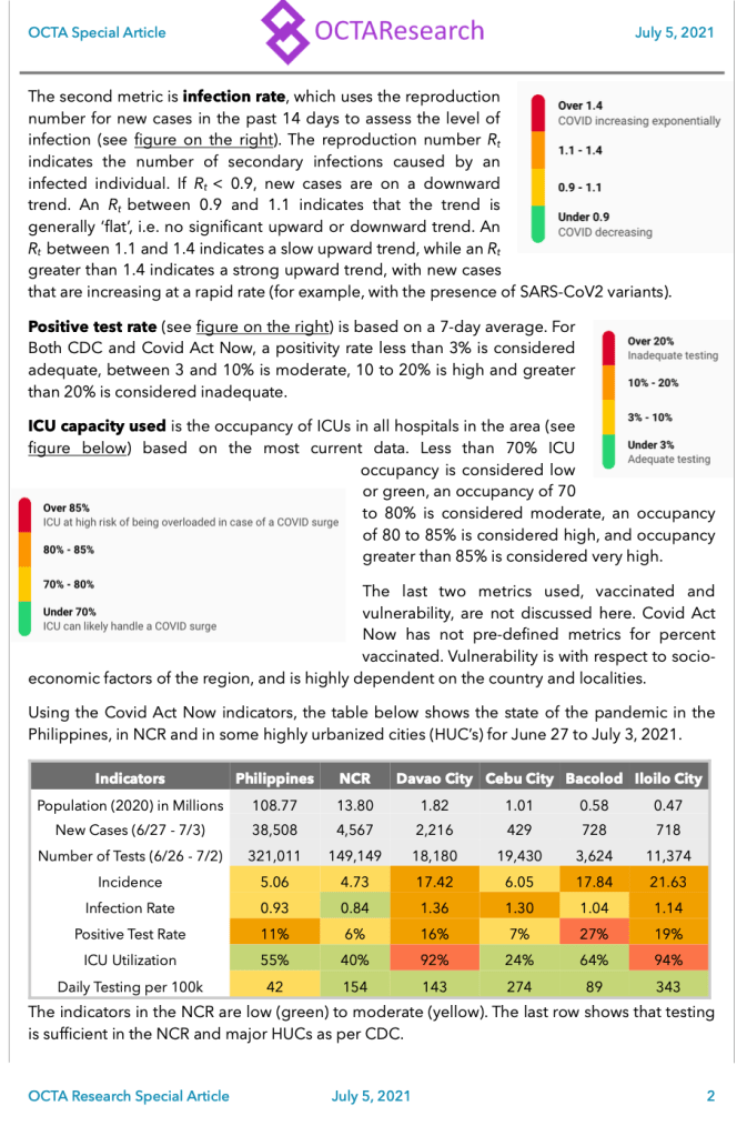 This set of indicators was published on July 5 and is expounded below. Standardizing indicators is vital in measuring how we are doing as a nation. This translates also to regional, provincial or LGUs in the country. Standardizing with metrics that have endpoints and are measurable are subject to less bias as well. Utilization of standardized metrics also affords one to make sound decisions on creation of policies and exit plans for the government.