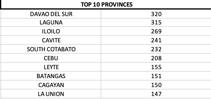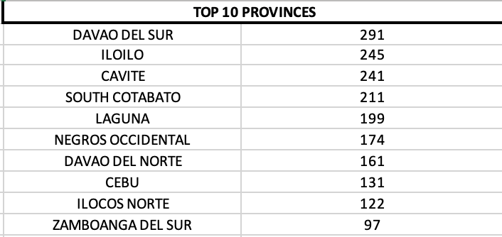 On a provincial level, Davao del Sur, Cavite and Laguna were the top three provinces.