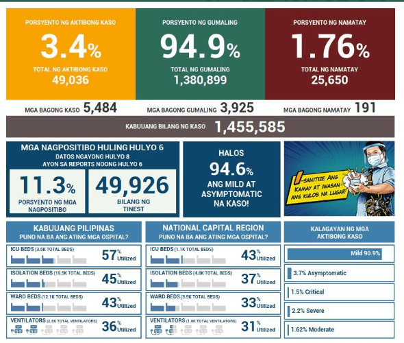 The Health Agency reports 5,484 new cases today for tests done last July 6, Monday, with 11.3% positivity rate. While this shows a continued slow down in cases, the deaths climbed quickly with 191 new death reported today. The case fatality ratio for outcomes stands at 1.82 percent.
