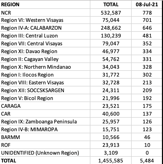 Western Visayas leads over all regions today, with cases pouring in from Iloilo and Negros Occidental provinces. NCR, CALABARZON, Davao Region and Central Visayas round up with the top five with more than 500 new cases apiece.