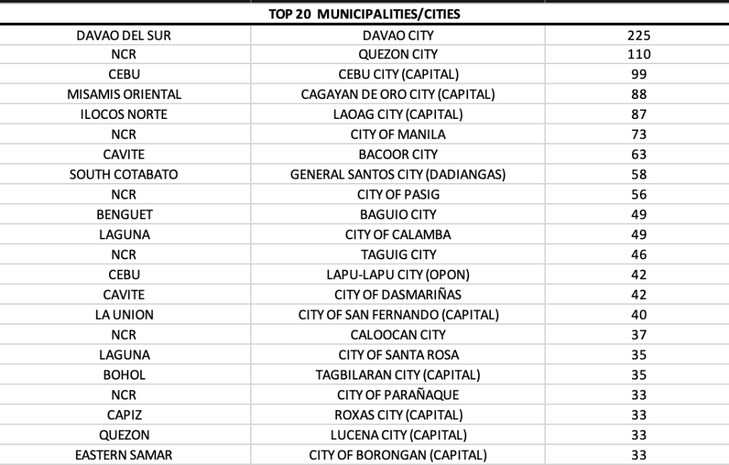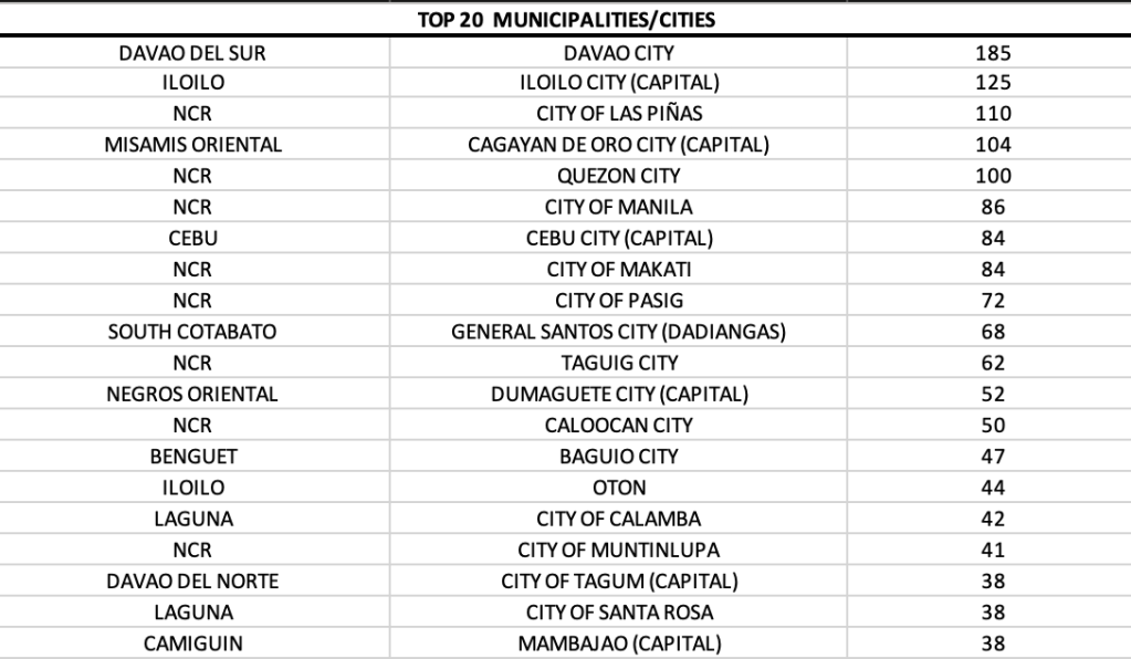 Davao City continues to lead among all LGUs in the country. Its total cases are more than the cases of second and third rank Quezon City and Iloilo City, respectively. Four cities in Laguna land in the top 20 – San Pedro, Santa Rosa, San Pablo and Biñan.