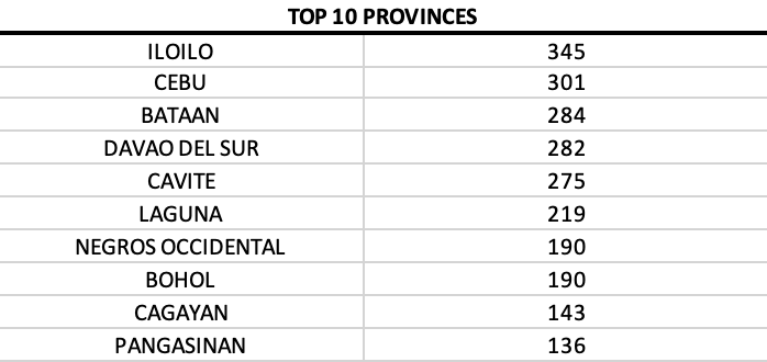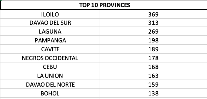 Iloilo Province, Laguna and Davao del Sur remain the top three provinces in the country with most cases. And Davao City continues to be the LGU with most cases today.