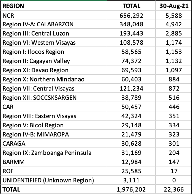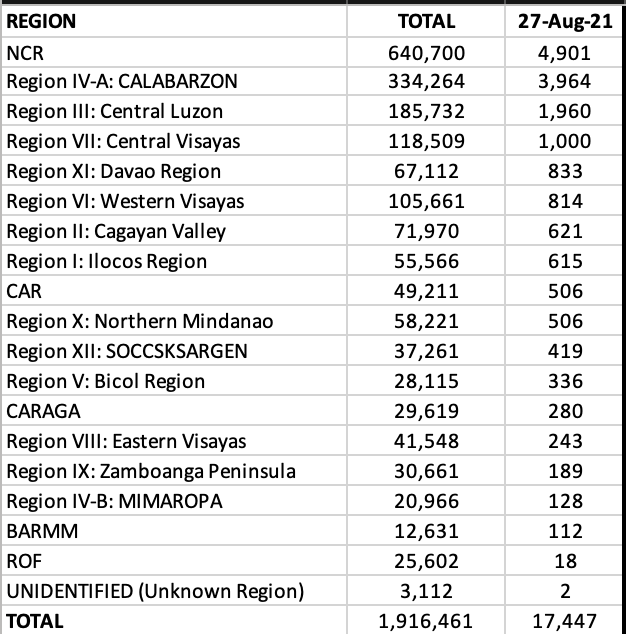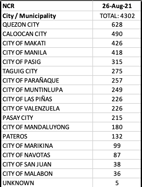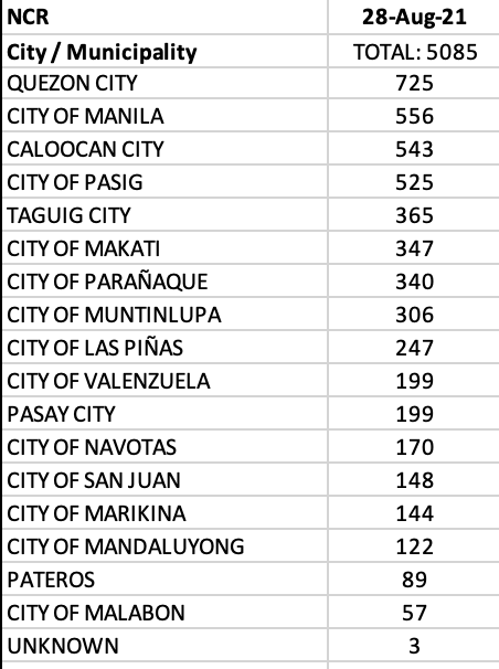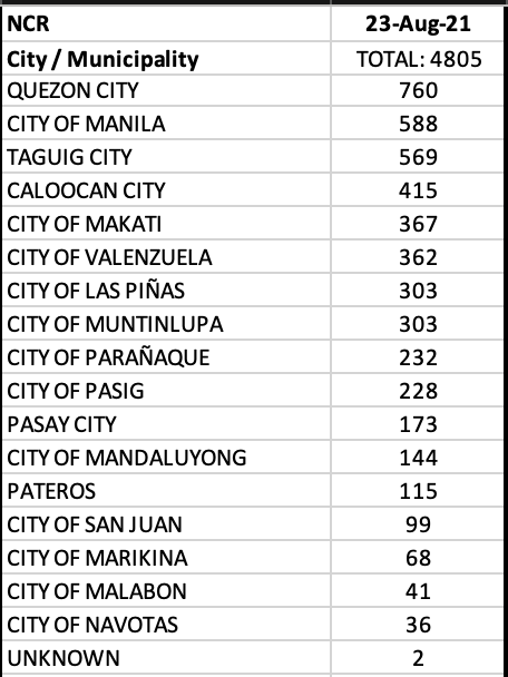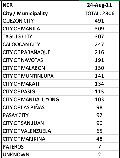 As the government began to lift a tighter lockdown in our rollercoaster ride of lockdowns, the growth rate in new cases declined a tad. While the growth rate continues to increase, it has slowed down. Which is like saying, yes the cases are still rising but not as much as the week before. The NCR now averages 3,819 cases daily (August 15-21 week) compared to the 3,088 daily cases for the week before (August 8-14).