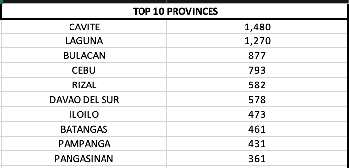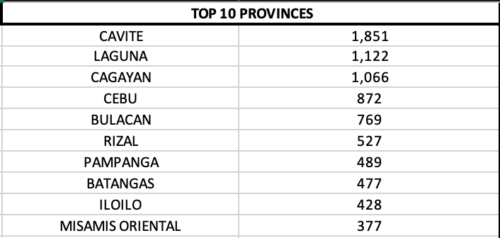 On a provincial level, Cavite, Laguna and Cebu reported quadruple digits.