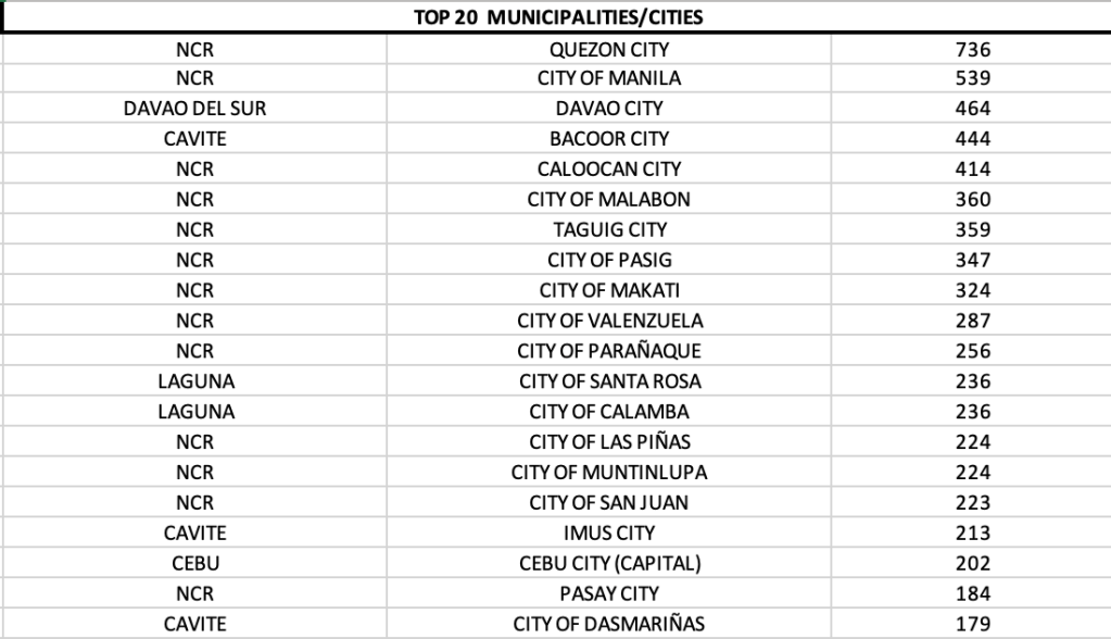 Eleven of 17 LGUs in NCR were in the top 20 cities with most cases, led by Quezon City. Four LGUs in Cavite were in the top twenty as well.