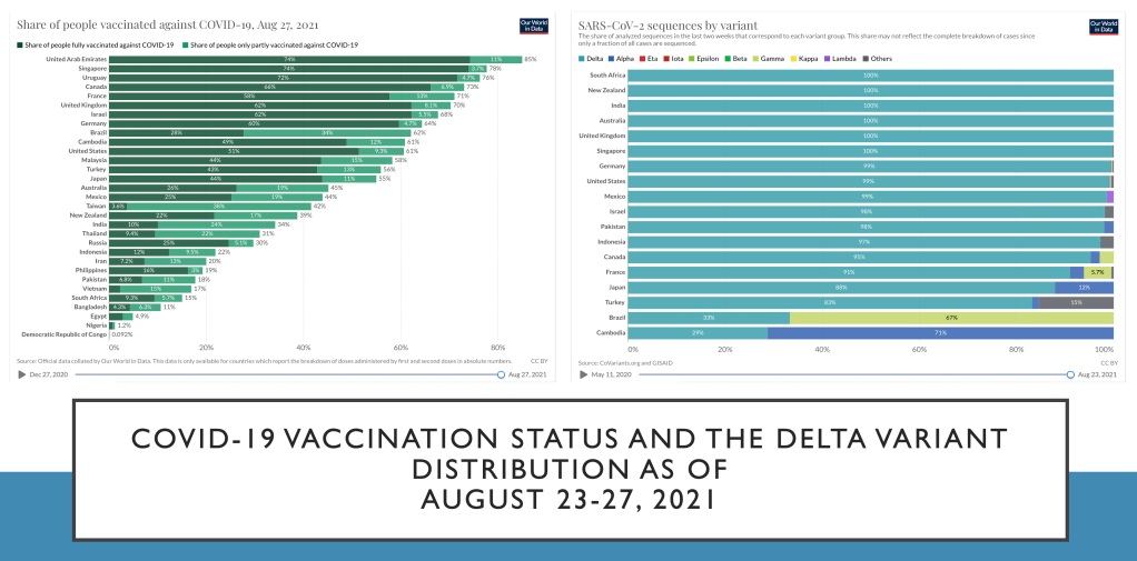 The state of vaccination in many parts of the world is provided in the final infographic. The delta variant has proven to be a formidable challenge, as many countries report this variant as the predominant circulating type for SARS-CoV-2. Undoubtedly, in the Philippines, delta has landed as well and is now in various communities.