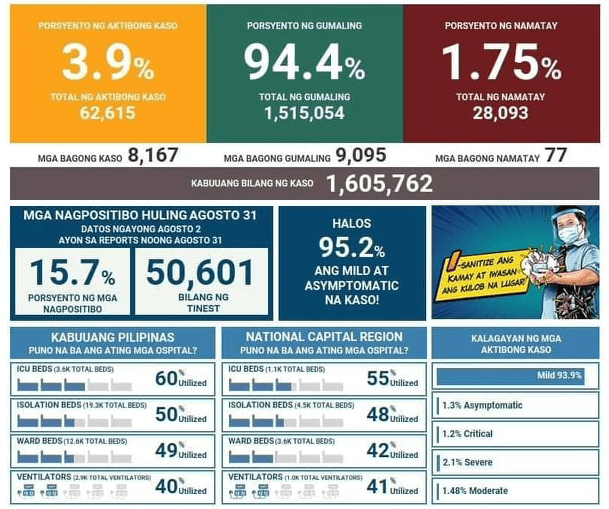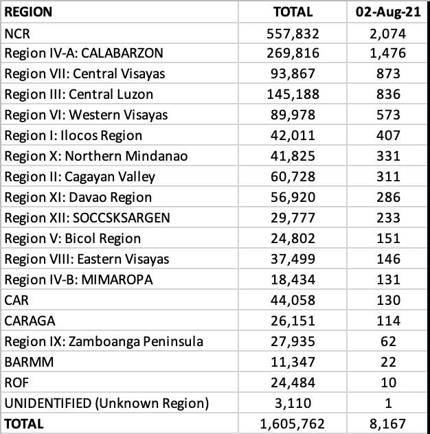 With 8,167 new cases reported today based on more than 50,000 tests done last July 31, (there is a typo error in the infographic of the Health Agency and that should read July not August 31), the positivity rate of 15.7% is worrisome. Not enough tests are being done, and not enough people are being contact traced. Todays new cases was enough to push the total COVID-19 cases to more than 1.6M.