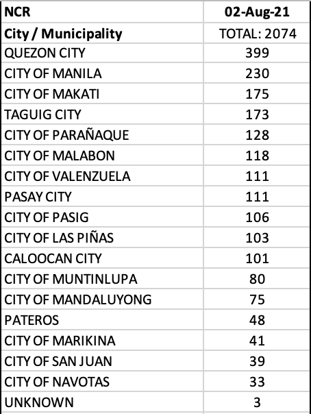 Among LGUs, Quezon City reported almost 400 new cases, followed by Cebu City, Manila, Cagayan de Oro and Makati City. We are back to that point where many LGUs in NCR are in the top 20. Today, 12 of 17 LGUs from NCR made it to the top twenty.