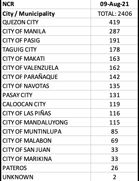 Among LGUs, Quezon City maintains its lead. The City of Manila, Cebu City, Cagayan de Oro and Dasmariñas (Cavite) are the others in the top five. Twelve of 17 LGUs in NCR are among the top twenty cities with most cases for the day.
