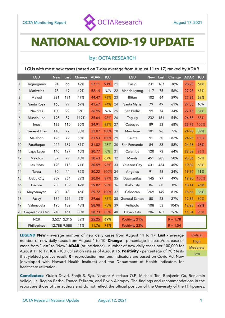 The NCR COVID-19 update is provided in today’s report as Mega Manila sees a 7-day average rise in new cases to 3,262 from the period August 9-15. This is a 51% increase from the cases the week before. Arranged according to incidence rate or ADAR (average daily attack rate), twelve LGUs are in critical level. They are: Navotas, Makati, Pateros, San Juan, Pasay, Muntinlupa, Mandaluyong, Valenzuela, Parañaque, Malabon, Pasig and Las Piñas.