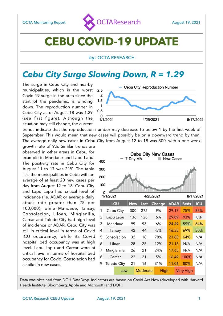 In yesterday’s OCTA Monitoring report, Cebu was the feature story. The surge seems to be winding down based on a slowing of cases are reflected in the reproduction number. Current trends show that R may dip to 1 by September and a downtrend would be a welcome respite for the region. While the incidence rate is still critical in Cebu City and Lapu Lapu City, hospital utilization is relatively better this week than the past weeks.