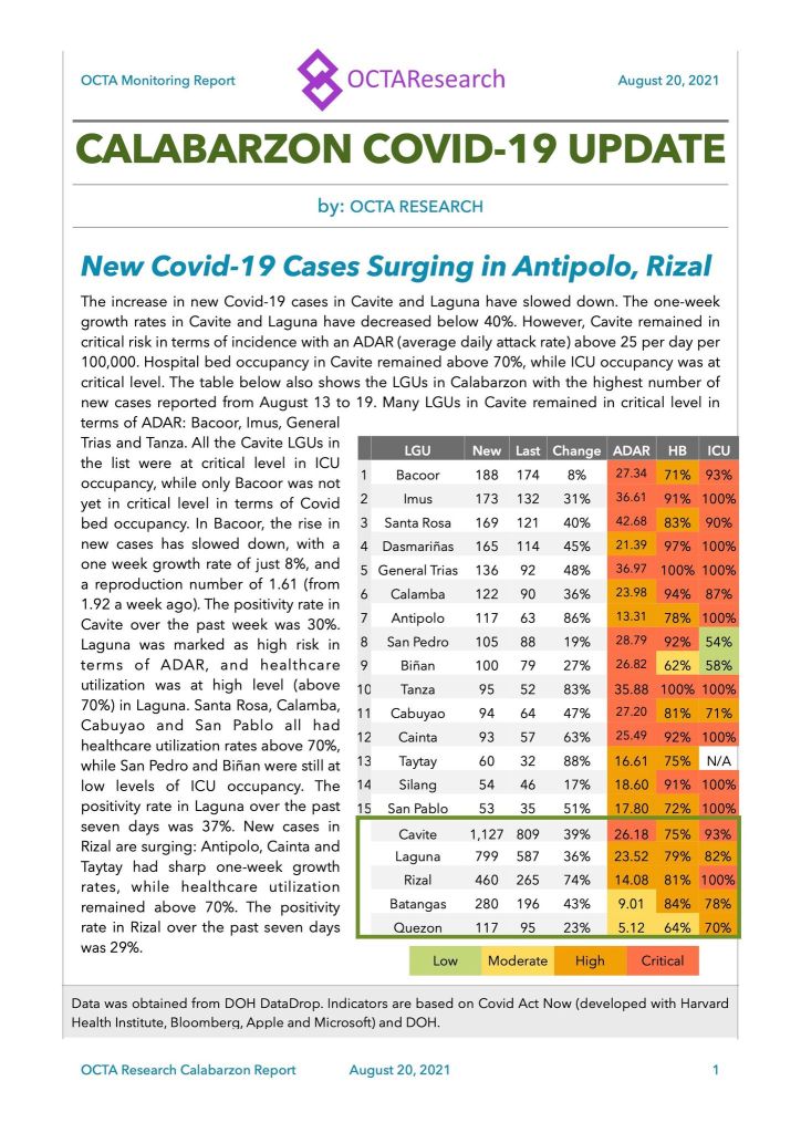 In today’s report, CALABARZON is the spotlight as the 16 LGUs enumerated show a marked increase in cases, including incidence rate, hospital beds and ICUs filled to the brim in the majority.