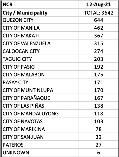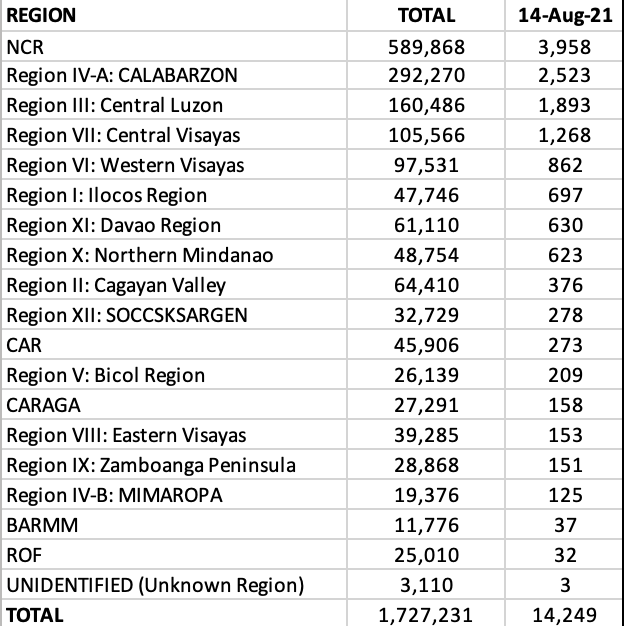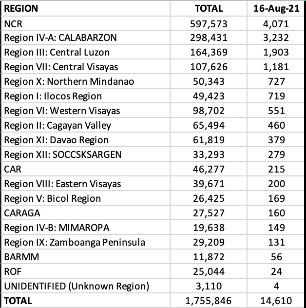 Of course, the first of the weekend report is from the OCTA Research group. For the week of August 8-14, 2021, the country now has a 7-day average of 11,000 cases/day. The Rt for this period is 1.46 and the growth rate in new cases up by 29% from the last week.