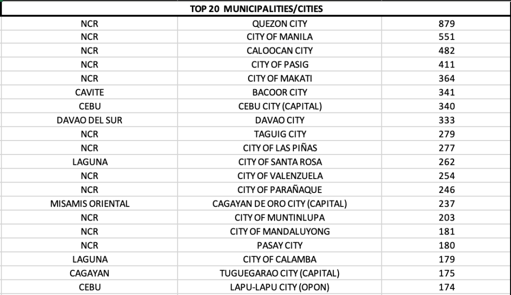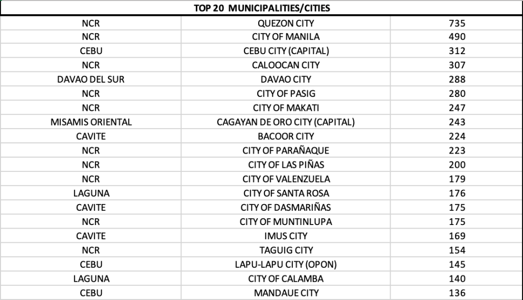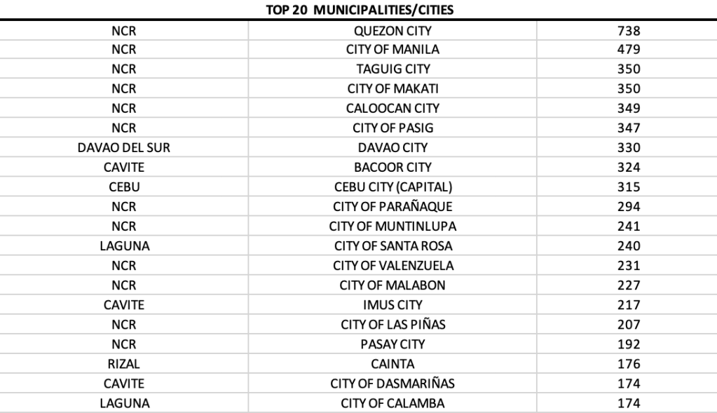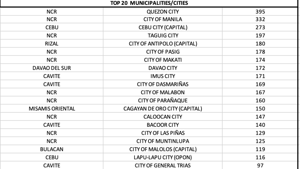On a provincial level, three provinces report quadruple digits – Cavite, Laguna and Cebu.