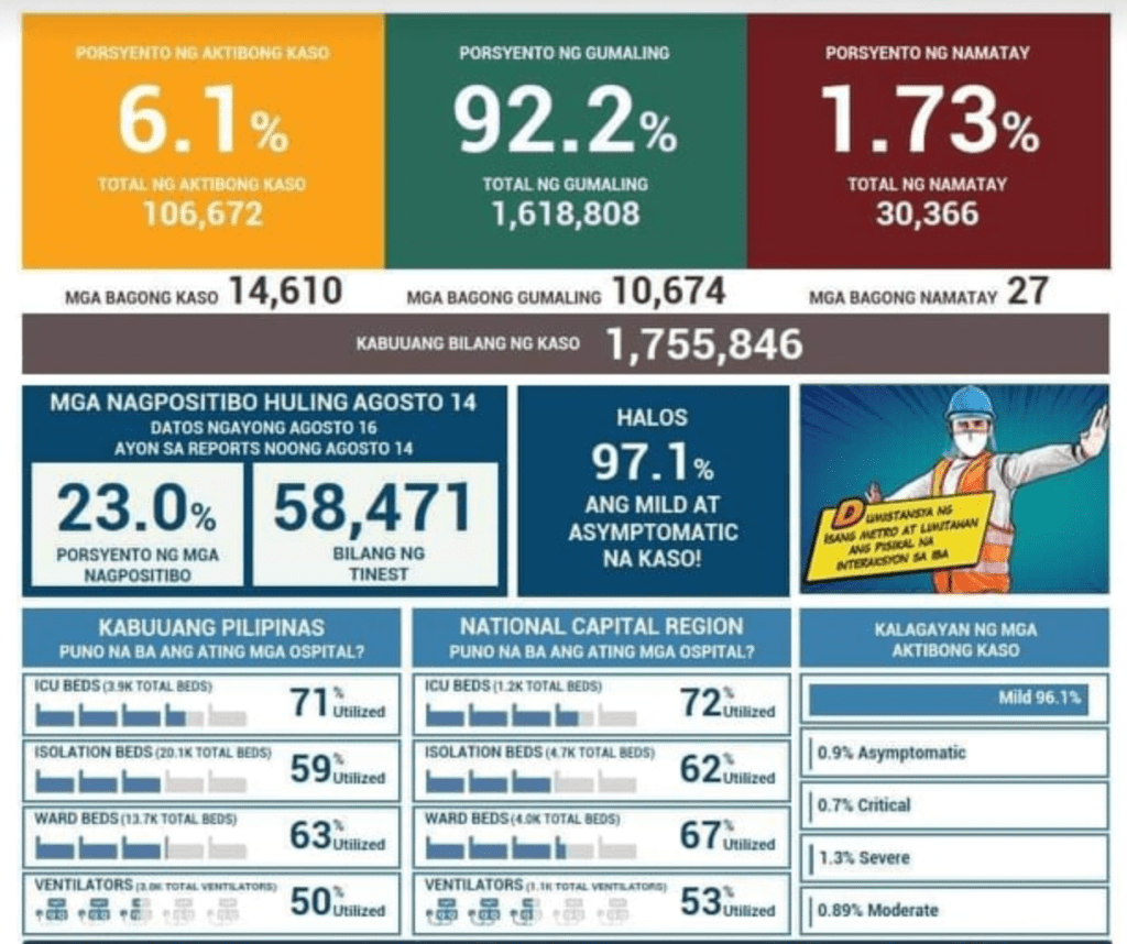 Without a doubt, the increase in cases has sent the hospitals to full capacity once more. On August 14, the Philippines recorded the second highest number of cases at more than 14,000 in a single day. Will we break the record set last April 2 where we posted 15,280 cases.