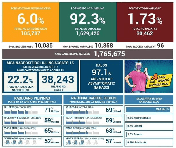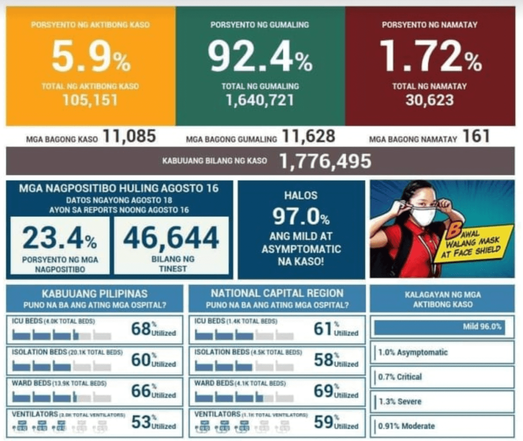 Friday the 13th ends with unsettling report of 13,177 newly announced cases. The additional bad news is that, of more than 57,000 tests done last August 11, 23.6% of them were positive. Which means that we brace ourselves for more cases in the upcoming days. Please remember that the new cases are not the same are the cases based on the tests done. They are two separate information – one on testing results and the other on newly verified cases.