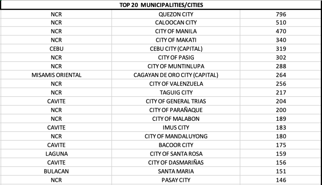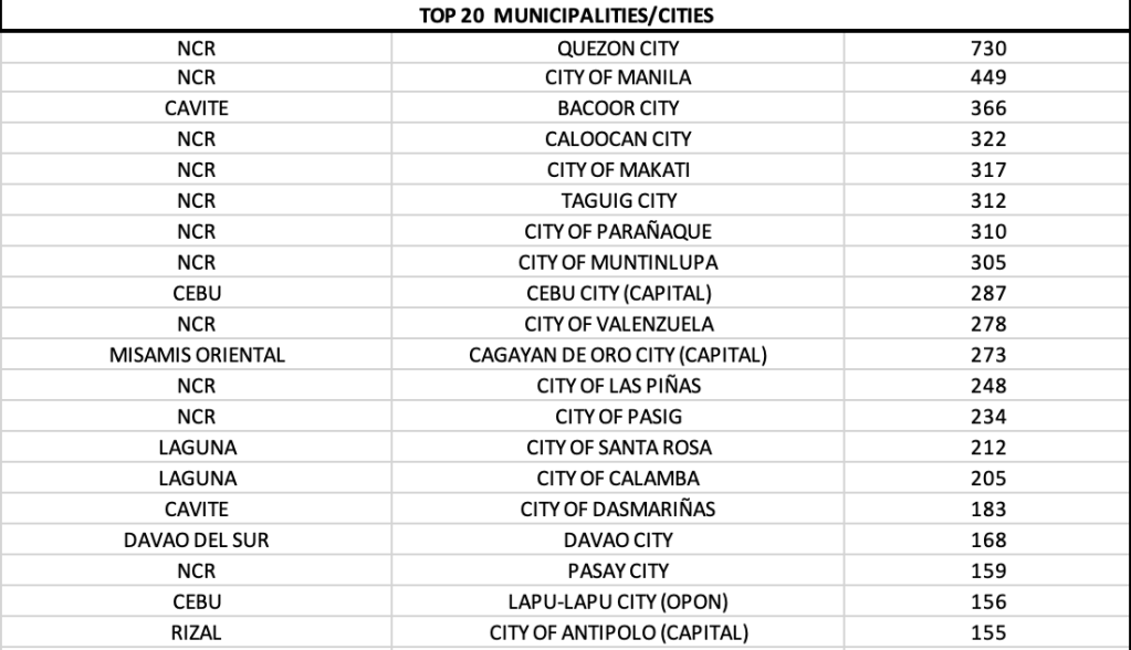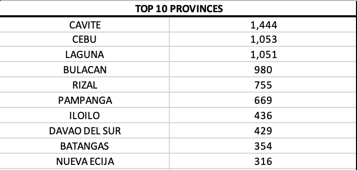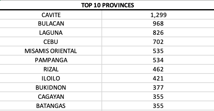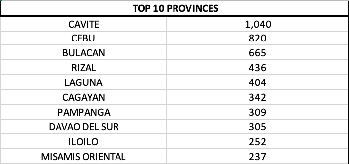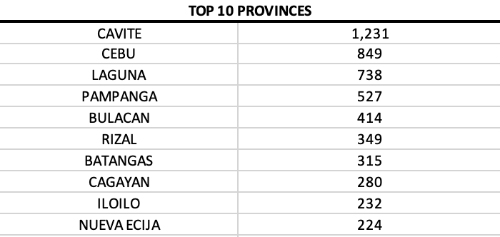 Cavite province, Cebu province and Laguna had the quadruple digits and ranked in the top three among provinces.
