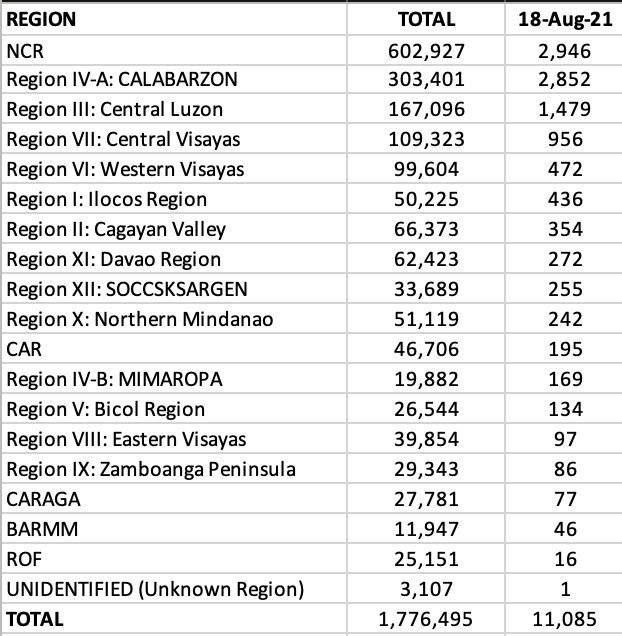 NCR alone accounted for close to 30% of the total cases today. Other regions that reported quadruple digits were CALABARZON, Central Luzon and Northern Mindanao.
