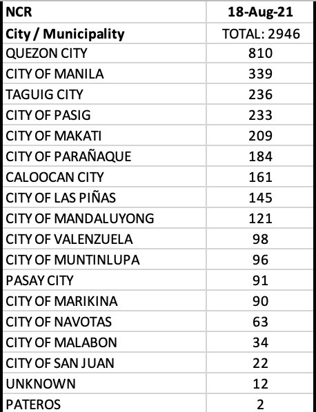 On an LGU level, Quezon City led the day to make 13 of 17 LGUs from NCR be included in the top 20 cities with most cases.