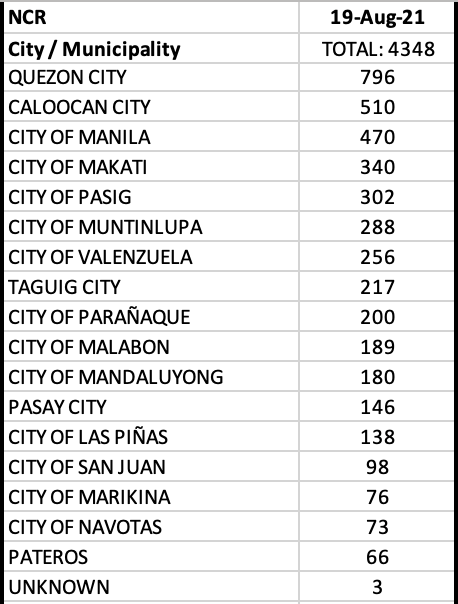 In the meantime, among LGUs, 12 or 17 LGUs in the NCR make it to the top twenty cities with most cases. The top five cities in the country for the day are all from NCR – Quezon City, Manila, Caloocan City, Pasig and Makati.