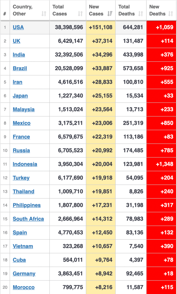 Japan led with more than 25,000 new cases. Malaysia landed in 7th rank and Indonesia continued to have declining cases but more deaths. Thailand, the Philippines and Vietnam are part of the top 20.