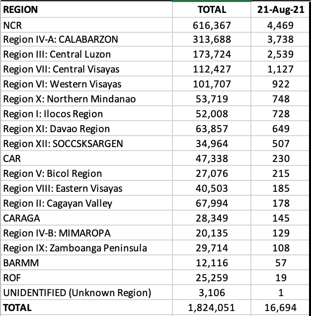Officially, the Philippines passes the 1.8M mark with 17,231 new cases announced today by the Health Agency – the highest one day tally of the country ever. This brings to more than 123,000 the active cases.
