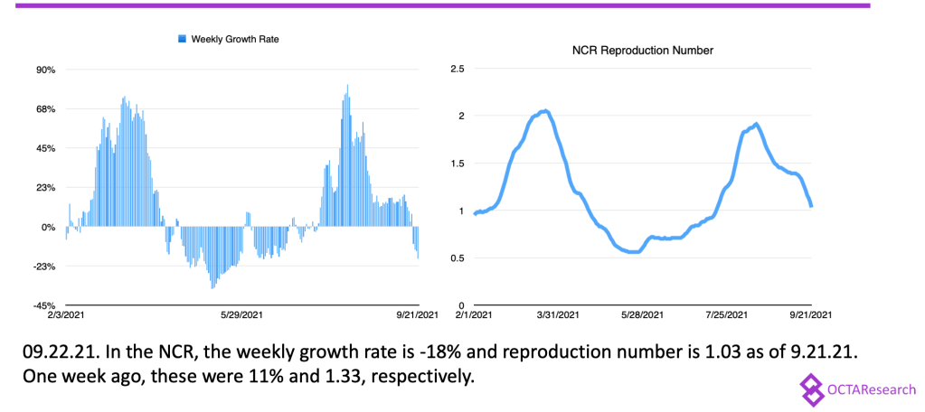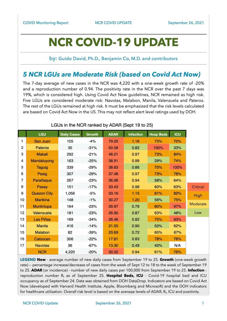 The average R for NCR is down to 0.94 (moderate risk) not including the data today. Ranked according to ADAR, five NCR LGUs are at moderate risk. They are: City of Manila, Malabon, Valenzuela and Pateros. Based on R, the cities of San Juan, Quezon City, and Marikina have R> 1.0. The cities with R<0.9 are: Pateros, Taguig, Muntinlupa, Valenzuela, Las Piñas, Manila, Malabon, Caloocan and Navotas.