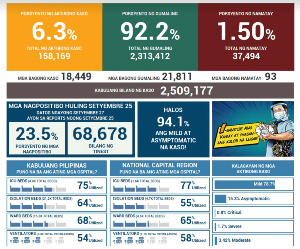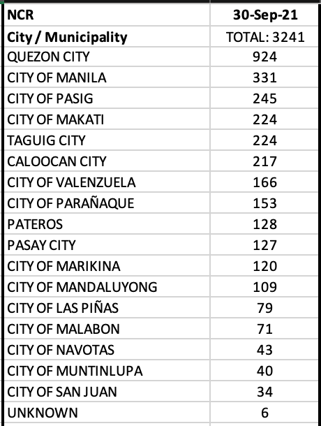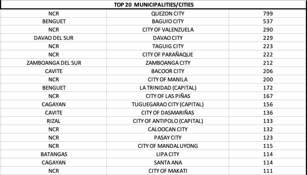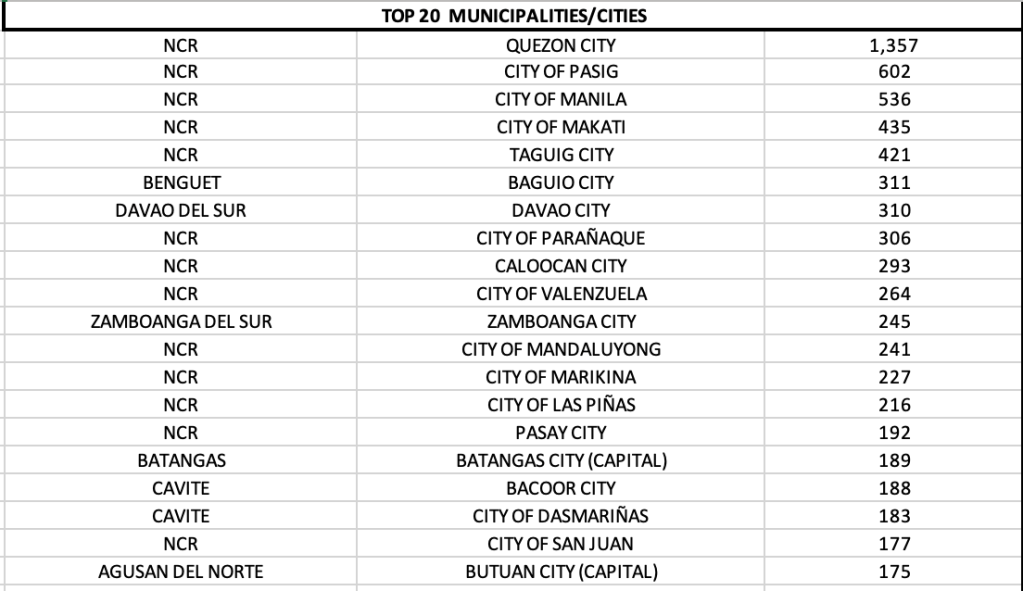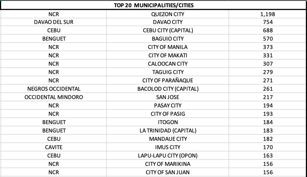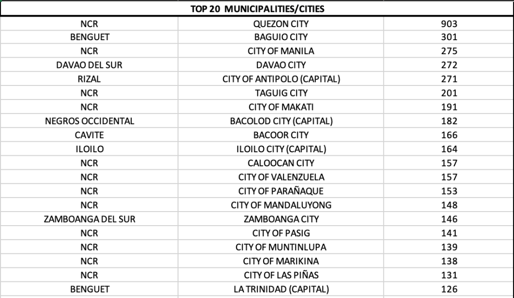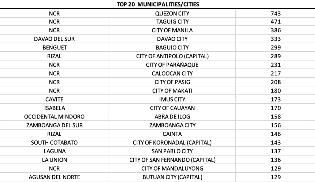 And 13 of 17 LGUs in NCR were among the top 20 cities/municipalities in the country with most cases for the day. Baguio City and Davao City remain in the top ten as well.