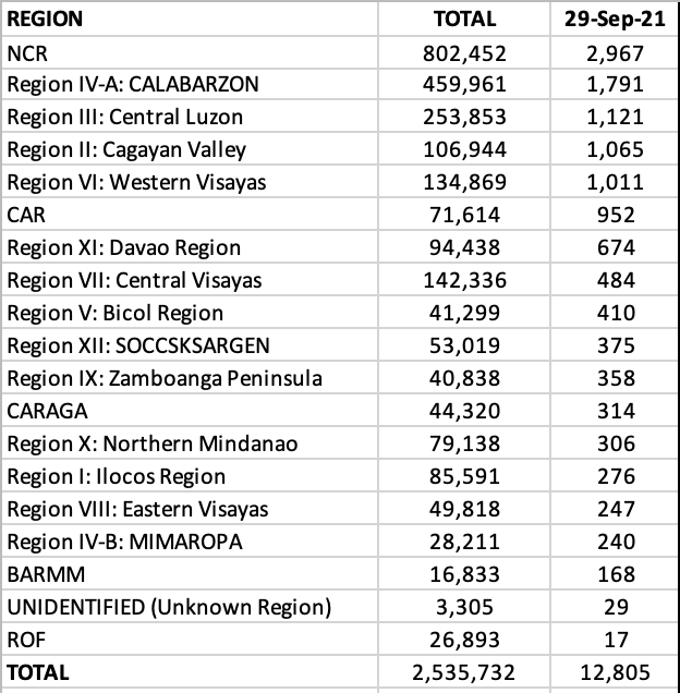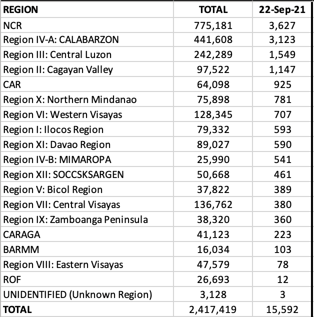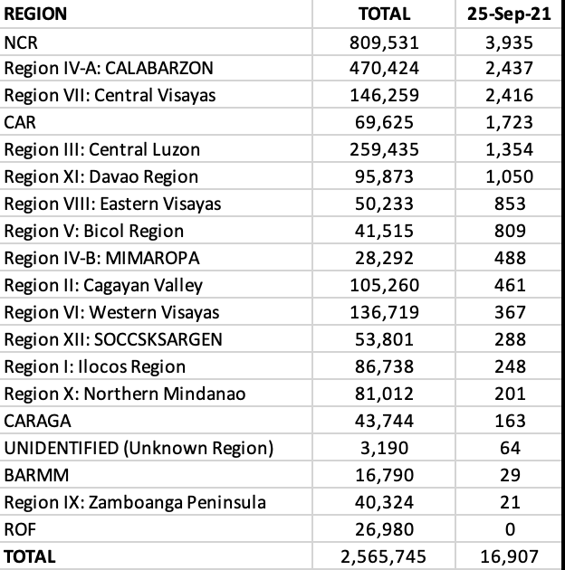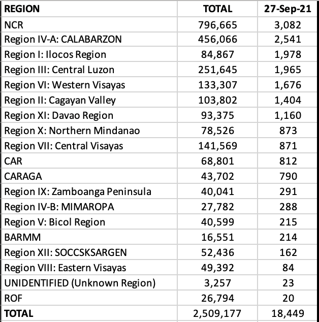 The NCR recorded a high 27.5% of the total cases today with more than 5,600 new cases. Other regions with 4 digits were: CALABARZON, Central Luzon, Ilocos Region, Cagayan Valley and Western Visayas. The rest of the regions report triple digits. There were 53 unknowns on this category.