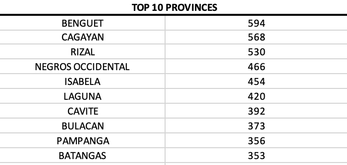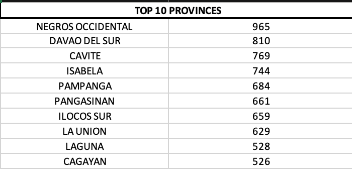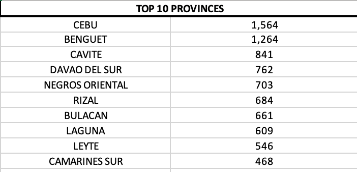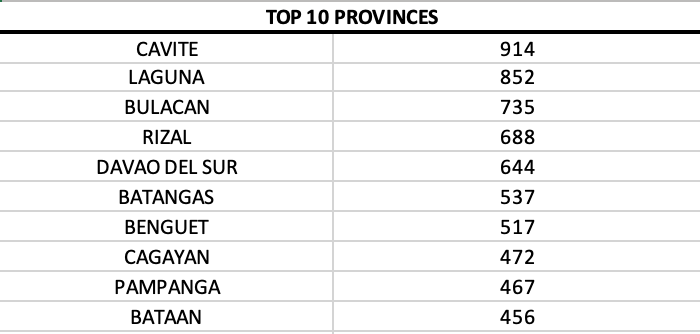 The provinces of Cavite, Rizal, Laguna and Batangas were on the top five list among provinces with most cases.