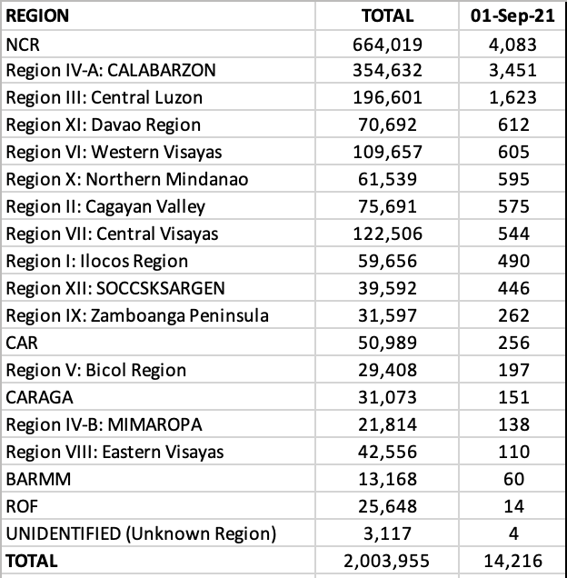 With the Health Agency announcing 14,216 new cases today, the country officially crosses the 2M mark. The active cases are down to a little more than 140,000. However, with more than 50,000 tests done on August 30 showing a positivity rate of 26.4%, this may mean that we may still see more than 20,000 cases any day this week.