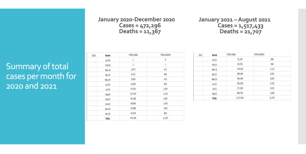 As additional information to the reader, is the summary of total cases per month since the pandemic began from January 2020-August 2021.
