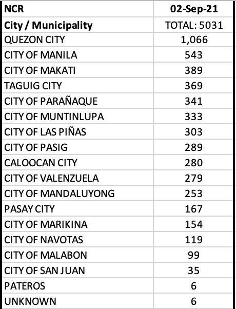 Thirteen of 17 LGUs in NCR are in the top 20 cities/municipalities with most cases. This, as the Department of Health announces, that all 18 regions in the Philippines now report delta variant present in each and every region. Other cities in the top 20 include 3 in Cavite, 2 in Laguna, Davao City, and Cebu City.