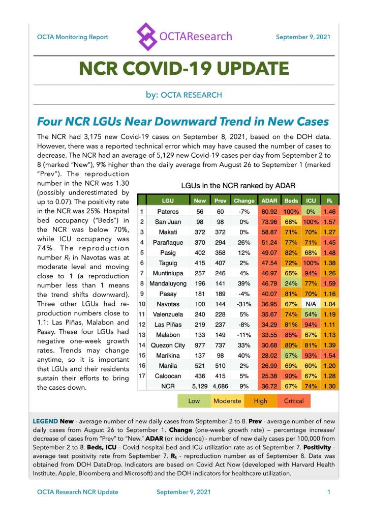 Nevertheless, the ADAR (incidence rate) remains critical in ALL the 17 LGUs in NCR, with Pateros, San Juan, Makati, Parañaque and Pasig having the highest. Bed utilization is critical in Pateros, Malabon and Caloocan. And the reproduction rate is highest in Mandaluyong at 1.59. Those included in the critical level are: San Juan, Marikina, Pasig, Pateros and Parañaque.