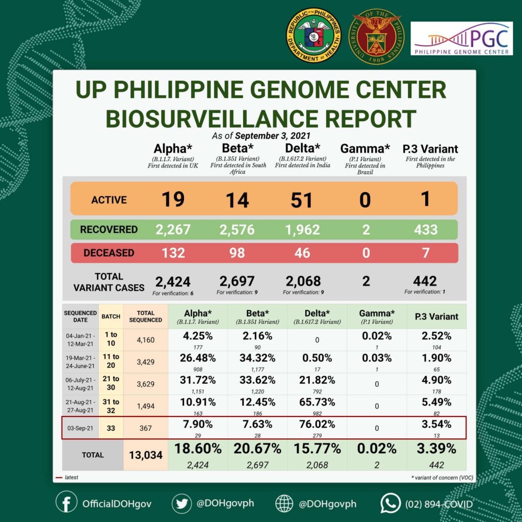 Without a doubt, the Philippine Genome Center Biosurveillance report shows that the shift in the major variant of concern in the country. Based on 367 sequenced samples on September 3, 2021, 76% of the batch were delta variants.