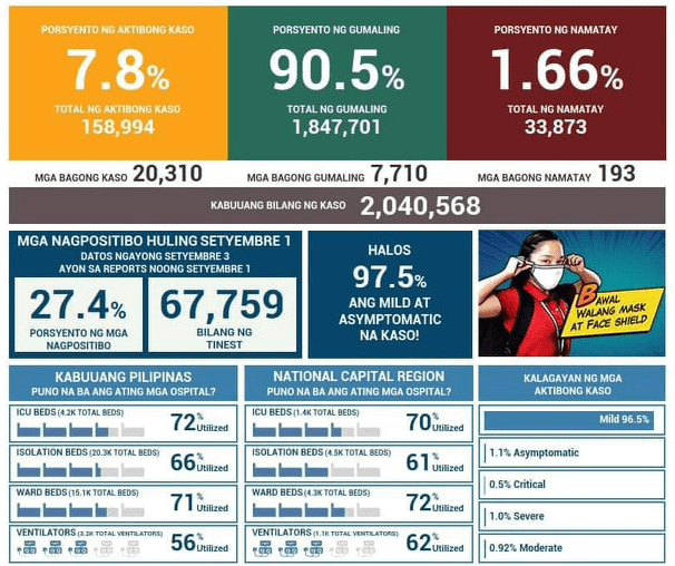 With the Health Agency announcing 14,216 new cases today, the country officially crosses the 2M mark. The active cases are down to a little more than 140,000. However, with more than 50,000 tests done on August 30 showing a positivity rate of 26.4%, this may mean that we may still see more than 20,000 cases any day this week.