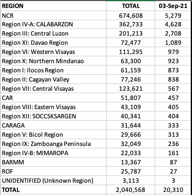 The NCR records also a record high of 6,335 new cases, with four other regions reporting quadruple digits. In fourth and fifth are Cagayan Valley and Davao Region. Again, it is important to emphasize that the erratic numbers and ranking in the different regions outside of NCR plus is secondary to the fact that the test results do not arrive at the same time. That lag, is something the Health Agency needs to fix. This lag is also due to the fewer laboratories outside of NCR plus. Results of patients from the other regions take a little longer to obtain.
