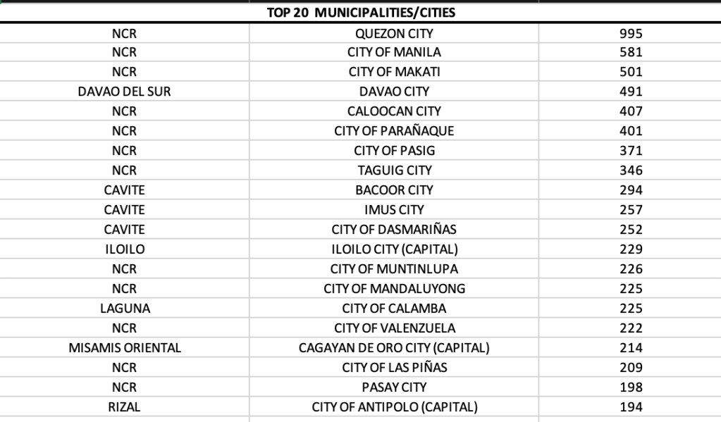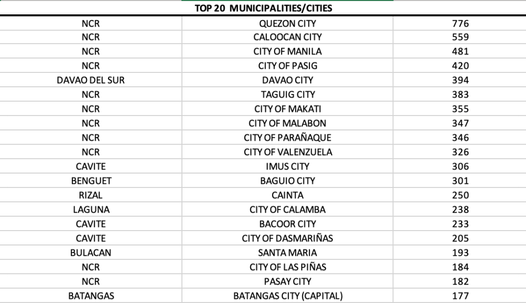 Twelve of 17 LGUs in NCR were in the top 20 list, with Quezon City back at quadruple digits. In CALABARZON, 3 LGUs in Cavite, 2 in Laguna and 1 in Rizal were among the top twenty.