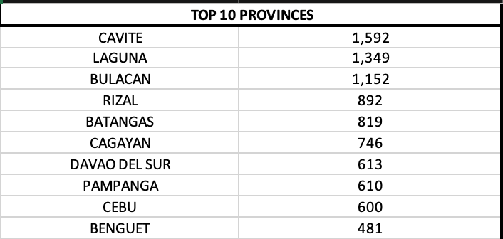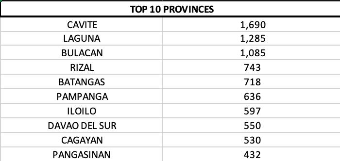 Cavite, Laguna and Bulacan had quadruple digits on a provincial level.