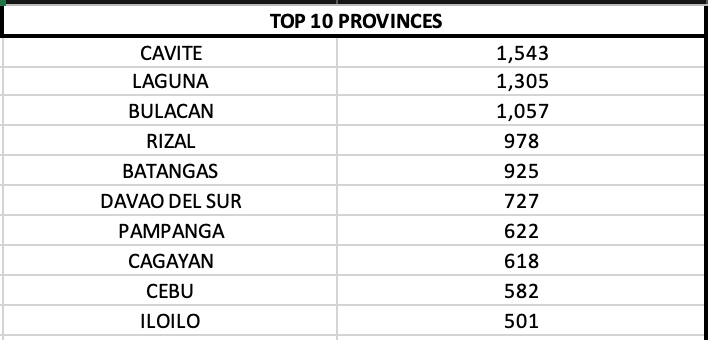 Cavite, Laguna, and Batangas – all provinces in Region IVA – are the top three provinces for the day.