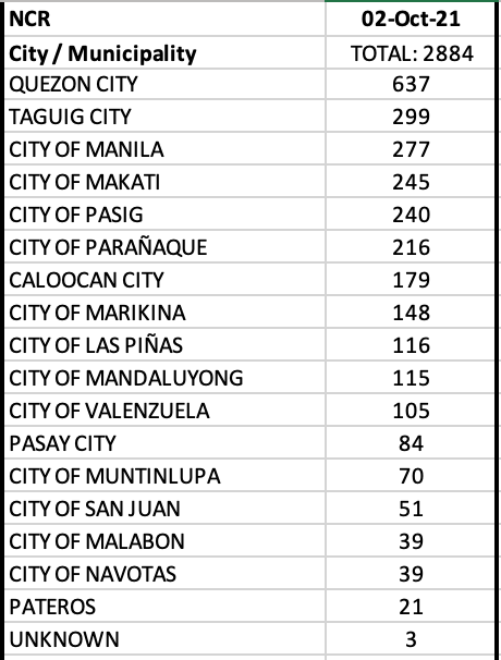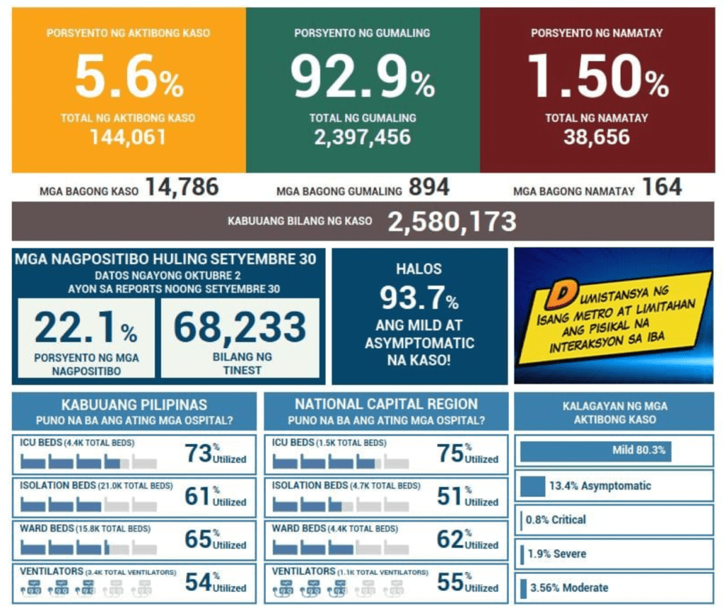 While this is good news, the unsettling issue is the testing. There were only 68,233 tests run on September 30, with a positivity rate of 22.1%. While there are more testing done in NCR and in other HUCs (e.g., Cebu), it is not the same across all provinces particularly in areas where there are few testing facilities. It cannot be overemphasized that the government needs to invest in more testing in order to see the true picture of the cases in the country. With more than 22% positivity, we are definitely under testing and under estimating the real number of cases of COVID19. You cannot control a pandemic properly if you do not see the enemy. You cannot rely on vaccination as the only exit strategy in this pandemic.