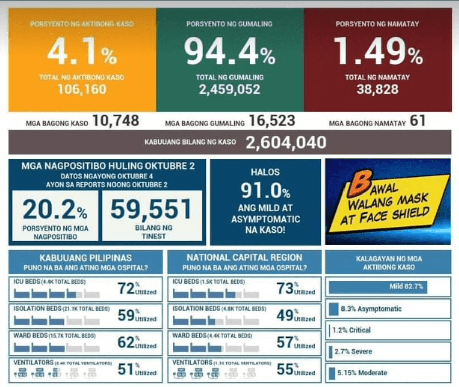 There were close to 60,000 tests done last October 2, a Saturday, with a 20.2% positivity rate (which is still considerably high).