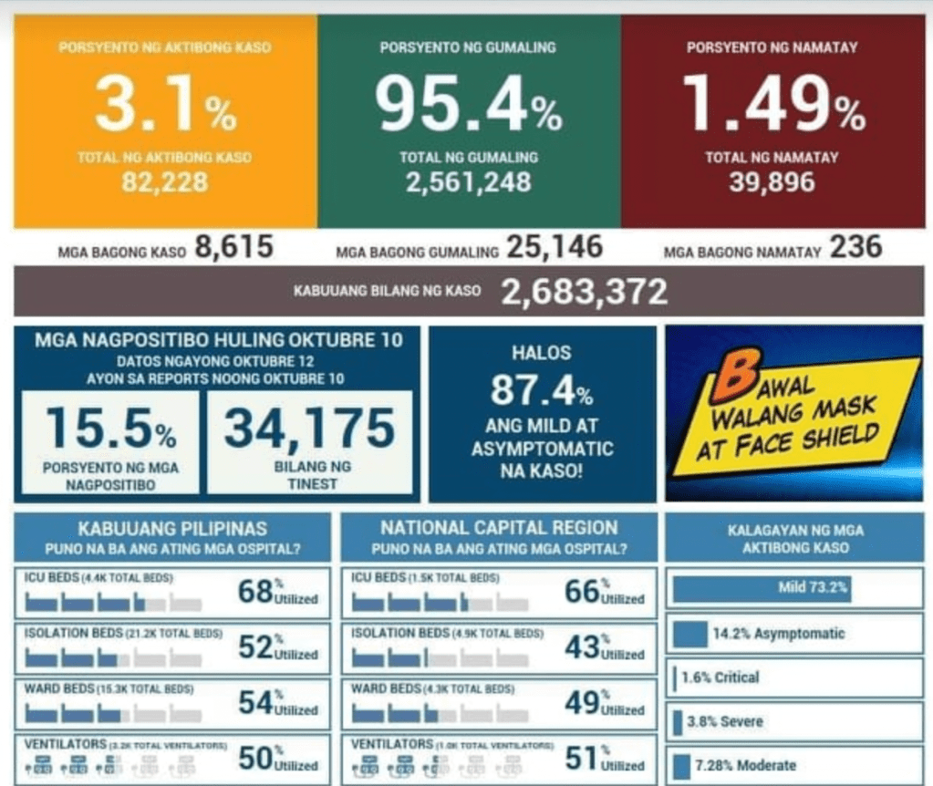 But it’s because there’s quite a number in the backlog. If you look at the tests done October 10, as the basis for the data released today, it is clear that only 34,175 tests were done with a positivity rate of 15.5% for that day. Note in the infographic that the Health Agency indicates “data for October 12 based on reports from October 10”. Mathematically that would come out to around 5,300 cases. The discrepancy in the 8,615 announced today and the 5,300 cases is most likely a backlog of 3,300 cases which have not been reconciled. While it is essential that every case unreported is counted as a new case, it would be informative if the DoH announce the actual count based on tests done and the amount of backlog cases included in the count.
